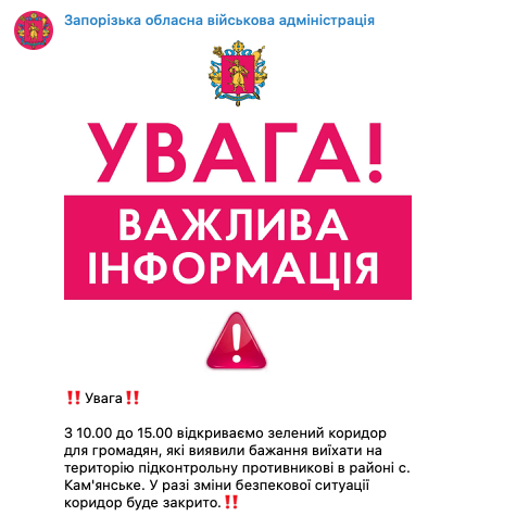 В Запорожье сегодня открыли коридор для выезда на оккупированную территорию - в Каменское. Он будет работать до 15 часов.