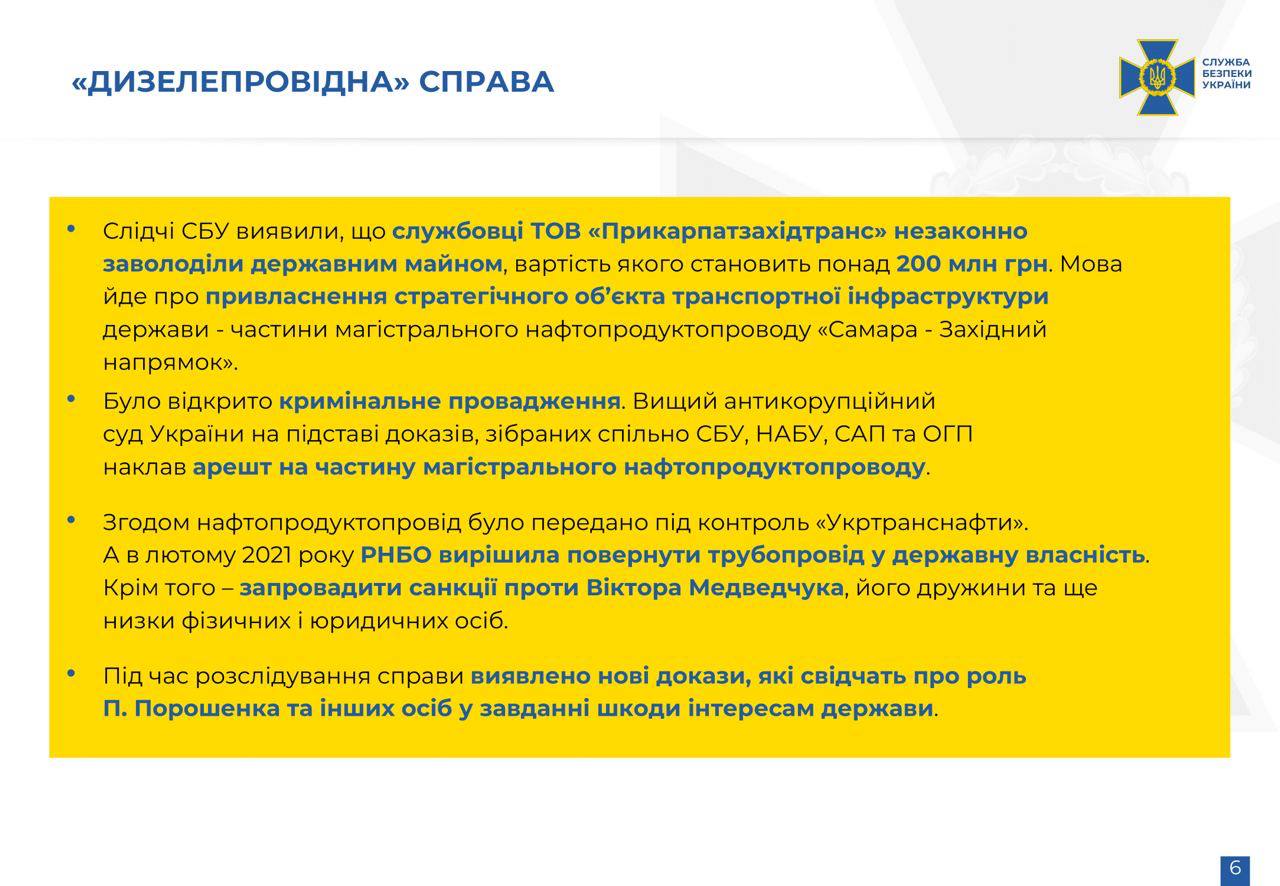 СБУ опубликовала видеосвидетельства Виктора Медведчука против Петра Порошенко. На видео Медведчук заявляет, что Порошенко обратился к нему с просьбой "по покупке трубы" - трубопровода компании "Транснефть", которая поставляет дизель из РФ в Украину и Европу.