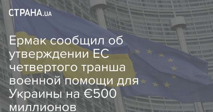 ЕС утвердил четвертый транш военной помощи для Украины на 500 миллионов евро. Об этом сообщает глава Офиса президента Андрей Ермак у себя в Телеграм.