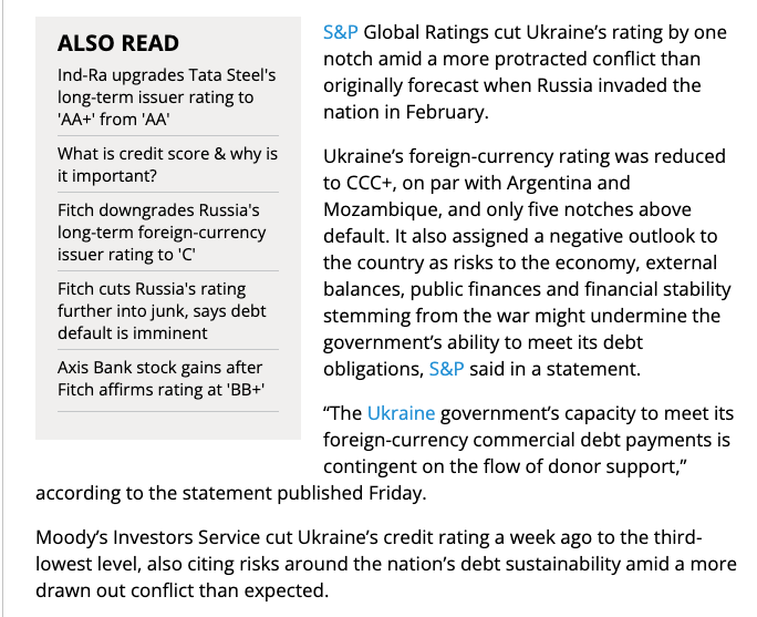 По мнению экспертов агентства, война в Украину затянется. А это приведет к ситуации, в которой выплата долгов Киевом будет в большей степени зависеть от международной помощи.