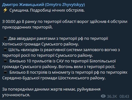 09:24 Приграничные районы Сумской области за ночь обстреляли 4 раза ракетами, РСЗО, САУ и минометами, сообщил глава Сумской ОГА Дмитрий Живицкий. В частности:
