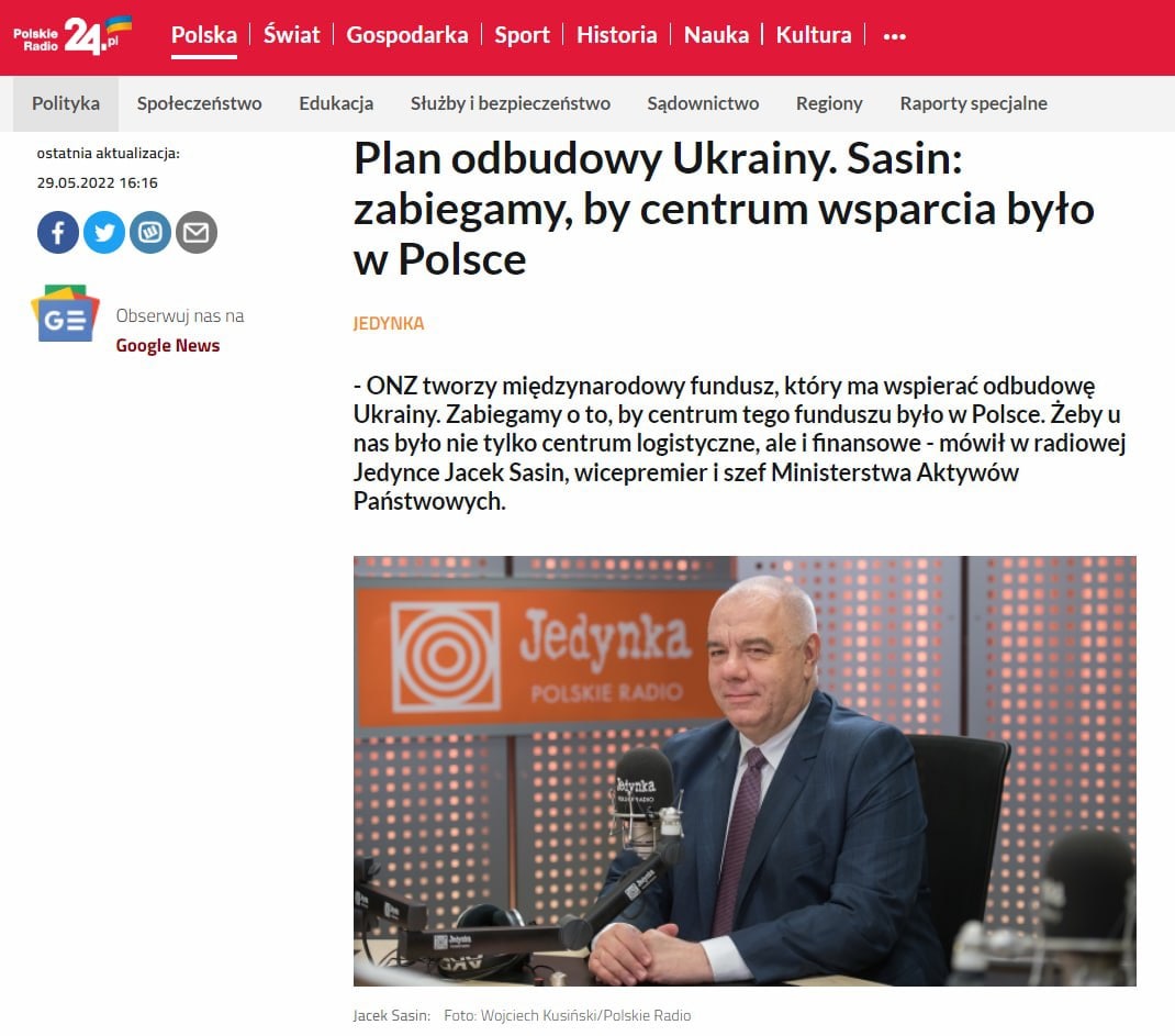 "Центр по восстановлению Украины", объединяющий различные предназначенные для этого финансовые фонды, должен находиться в Варшаве, считает вице-премьер правительства Польши Яцек Сасин.