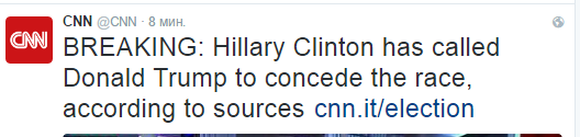 9 ноября, 19.12. Хиллари призвала своих сторонников признать Трампа президентом
