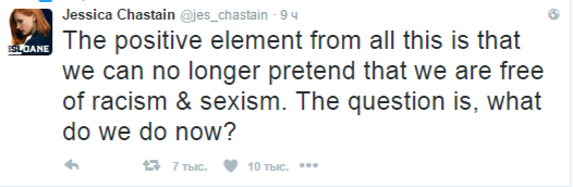 Актриса и двукратная обладательница Оскара, звезда киноэпопеи "Интерстеллар" Джессика Честейн отметила положительный момент происходящего: "Мы больше не можем притворяться, что свободны от расизма и сексизма. Вопрос в том, что нам делать сейчас?"