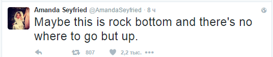Актриса Аманда Сайфред (сериал Твин Пинкс, фильмы "Время", "Хлоя", "Третий лишний") предположила, что "достигнуто дно, и остается единственный путь – наверх".