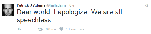 Актер Патрик Джей Адамс, известный по сериалу "Форс-мажоры" сказал: "Дорогой мир. Я приношу извинения. Мы все лишены дара речи".