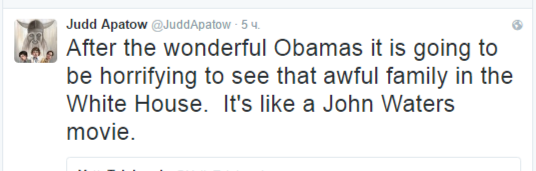 Режиссер, продюссер и сценарист фильмов "Кабельщик", "Аферисты Дик и Джейн" Джадд Апатоу посетовал, что в Белом доме после чудесных супругов Обама будет ужасно видеть "ту ужасную семью". Он сравнил происходящее с плохим кино.