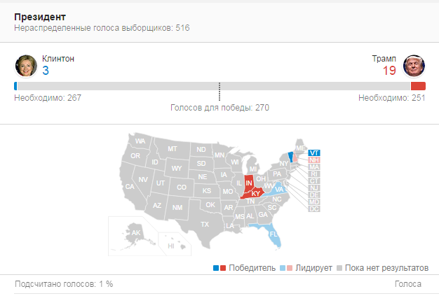 8 ноября, 10.05. На Севере США Трамп обгоняет Клинтон