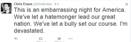Актер Крис Эванс, сыгравший Капитана Америка в "Мстителях", назвал случившееся "неловкой ночью"для США. Он раскритиковал Трампа и признался, что опустошен.
