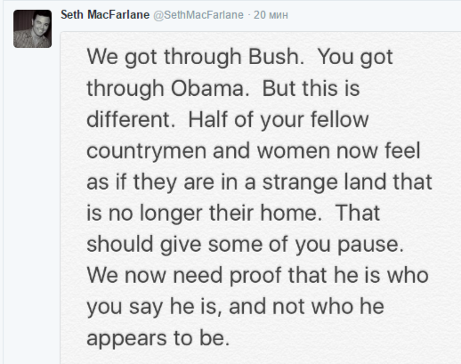 Звезда "Гриффинов" Сет МакФарлейн отметил: "Некоторым не нравился Буш. Некоторым не нравился Обама. Но это другое. Забудьте о неприязни. Сейчас многие испытывают неподдельный страх. Это новое".