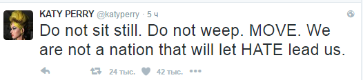 Певица Кэти Перри в своем Twitter призвала не бездействовать и не плакать: "Двигайтесь. Мы не та нация, которая позволит ненависти править нами".
