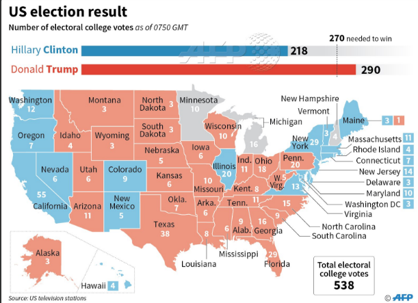 Исход президентских выборов в США определяется не всеобщим голосованием по всей стране, а коллегией выборщиков и зависит от результатов голосования в каждом из 50 штатов и Вашингтоне. Для победы главным фаворитам гонки, Клинтон или Трампу, необходимо заручиться голосами не менее 270 выборщиков из 538.