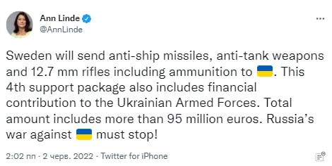 Швеция предоставит Украине военную помощь на 95 миллионов евро.