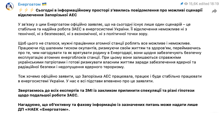 "Сегодня в информационном пространстве появились сообщения о возможных сценариях отключения Запорожской АЭС. В связи с этим Энергоатом официально заявляет, что сегодня существует только один сценарий – это стабильная и надежная работа ЗАЭС в энергосистеме Украины. Ее отключение невозможно ни с точки зрения безопасности, ни с технической, ни с экономической, ни с политической точки зрения", — говорится в сообщении.