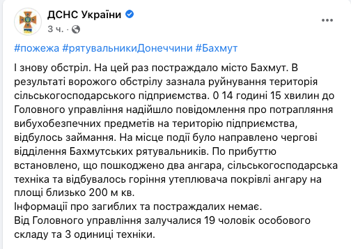 Город Бахмут в Донецкой области сегодня подвергся обстрелу, в результате которого было уничтожено сельскохозяйственное предприятие.
