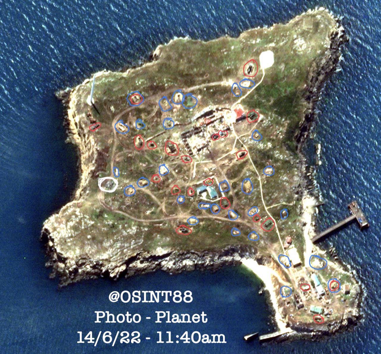 На юге свежие спутниковые снимки показывают, что Россия усиливает свою военную группировку на острове Змеиный. На фото видны системы ПВО, бензовозы, РЛС и центр управления. Синим выделены места маскировки, красным - транспорт, радар, топливо.