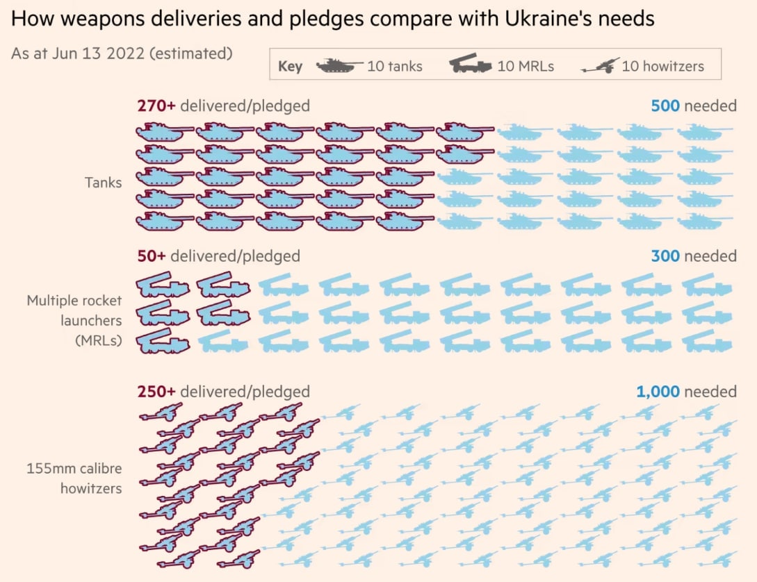 Как видим, наиболее оптимистичная ситуация с танками, запрос удовлетворен более чем на половину. Также объем поставленных гаубиц составляет почти четверть потребности. Наиболее печальная ситуация с РСЗО. Их объем ничтожно мал в сравнении с запросами (хотя вчера Пентагон пообещал дать новые установки, но количества не уточнил)