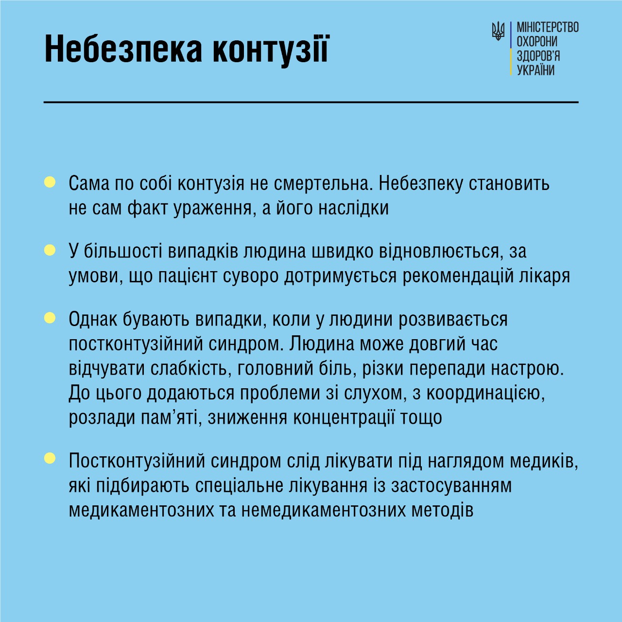 В инфографике Минздрава можно узнать об основных симптомах и опасности контузии, а также как оказать помощь человеку, у которого наблюдаются симптомы контузии.