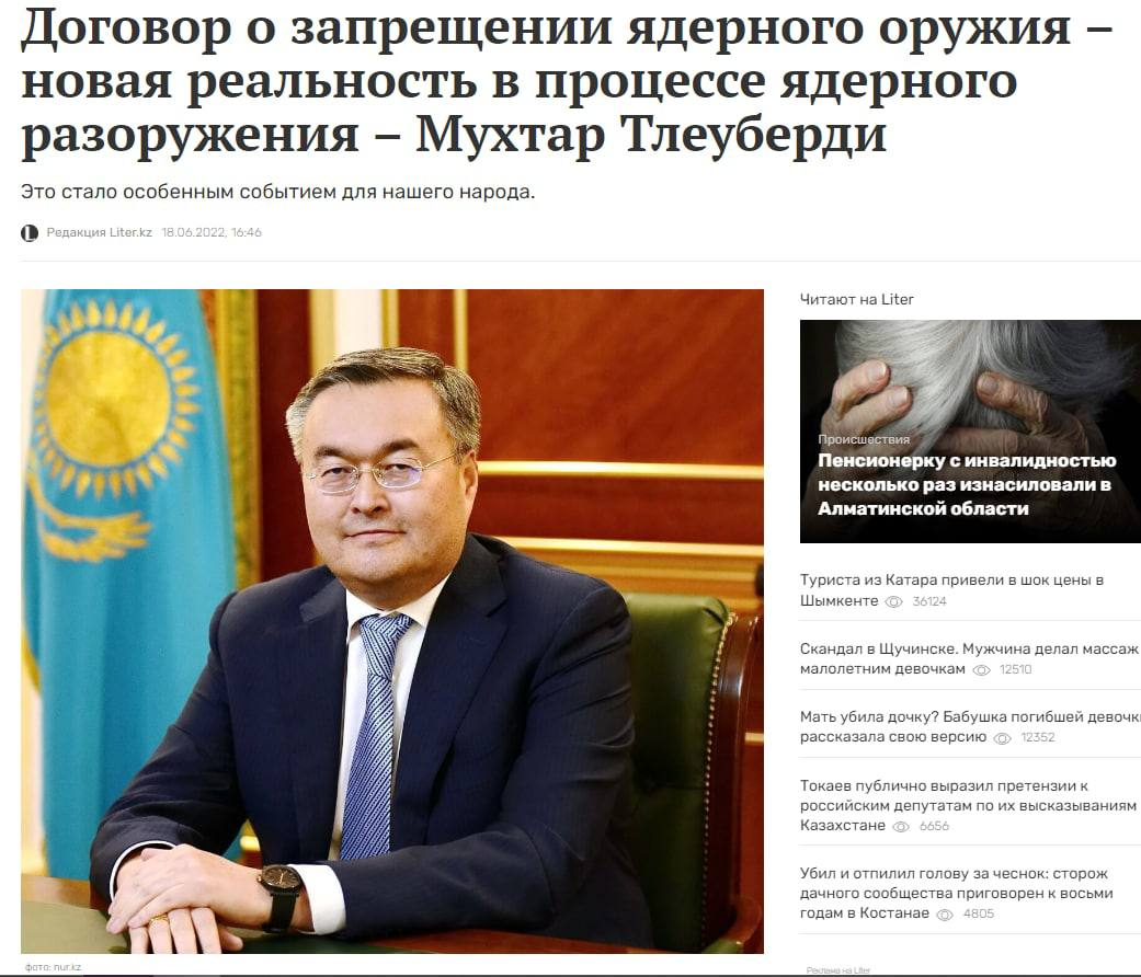 "Как отмечает генеральный секретарь ООН Антониу Гутерриш, сегодня, когда по всему миру рассредоточено около 13 400 ядерных боеголовок, возможность применения ядерного оружия стала реальней, чем в самые мрачные дни холодной войны. Нынешний военный конфликт на территории Украины, разговоры о возврате ядерных вооружений и взаимные угрозы применения ядерного оружия заставляют нас, как никогда прежде, задуматься о коллективной уязвимости человечества и о насущной необходимости запрета и ликвидации этого смертоносного оружия", - заявил Тлеуберди.