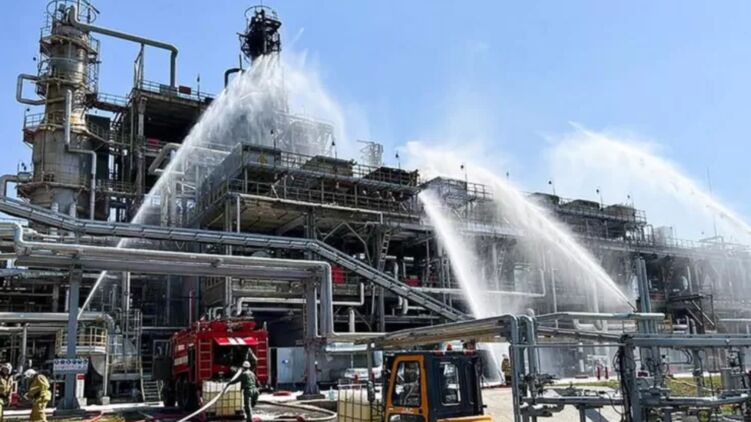 Пожарные тушат НПЗ после удара. Фото: ТАСС