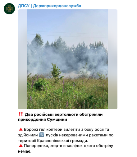 Вертолеты вылетели со стороны России и осуществили шесть пусков неуправляемыми ракетами по территории Краснопольской громады.