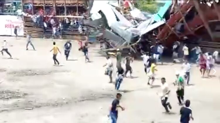 На видео хорошо видно, как часть конструкции рушится и, кто может, спасается бегством, кто-то пытается успокоить быков, а другие стремятся помочь раненым.