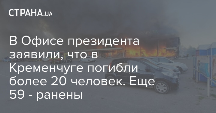 Замглавы Офиса президента (ОП) Кирилл Тимошенко заявил, что в Кременчуге "более 20" погибших и 59 раненых в результате удара российской ракеты по ТЦ.