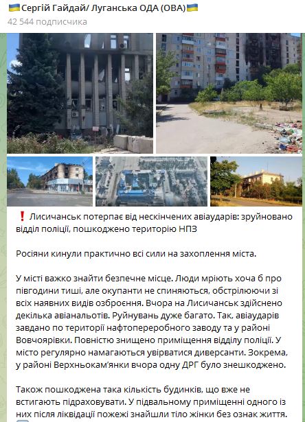 "В городе тяжело найти безопасное место" - сообщает глава ОВА. Вчера на Лисичанск было совершено несколько авианалетов. Разрушений очень много. Авиаудары нанесены по территории нефтеперерабатывающего завода и в районе Волчеярки. Полностью уничтожено помещение отдела полиции. В город регулярно пытаются ворваться диверсанты. В частности, в районе Верхнекаменки вчера одна ДРГ была обезврежена.