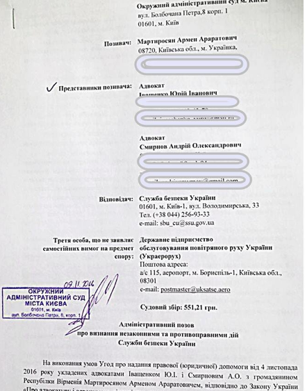 Адвокат Мартиросяна Юрий Иващенко продемонстрировал иск в Окружной административный суд Киева. "Суть иска - незаконный возврат воздушного судна, незаконное снятие пассажира с борта самолета, противоправный досмотр по процедуре таможенного досмотра. Фактически произошло задержание иностранного гражданина", - пояснил адвокат.
