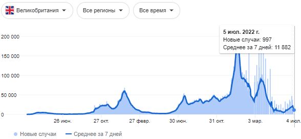В Великобритании на 1 июля заболевших было около 2,3 млн, то есть каждый тридцатый житель страны. Это на 32% больше, чем всего неделю до этого.