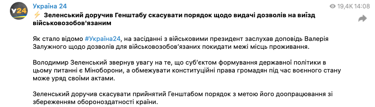 Зеленский поручил отменить норму о запрете военнообязанным ездить по Украине без разрешения военкомата - СМИ