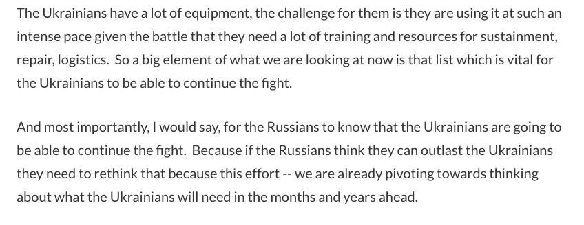 "Главное, чтобы русские знали, что украинцы смогут продолжать борьбу. Если русские думают, что смогут продержаться дольше украинцев, то им нужно это переосмыслить. Мы уже думаем над тем, что понадобится украинцам в предстоящие месяцы и годы", - заявили в министерстве обороны США.