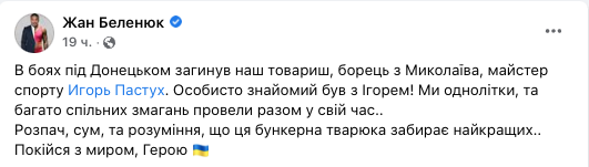"Лично знаком был с Игорем! Мы сверстники, и много совместных соревнований провели вместе в свое время", - пишет Беленюк.