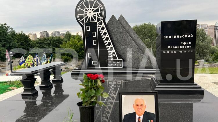 На могиле экс-премьера Ефима Звягильского на Байковом кладбище появился памятник с изображением шахты. Фото