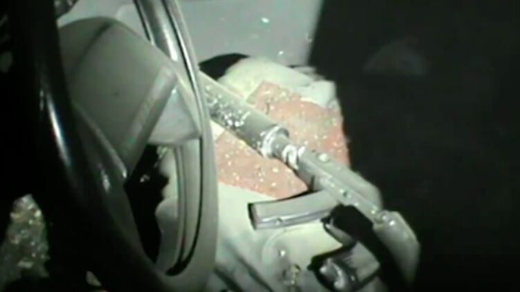Там виден белый микроавтобус с нанесенной буквой "Z", вероятно, принадлежавший нападавшему. А на переднем сидении автобуса лежит автоматическое оружие с глушителем.