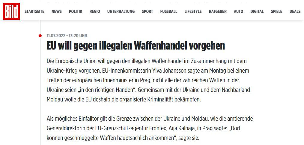 Ранее глава Европола Катрин де Болле озвучила обеспокоенность количеством оружия, которое поставляют в Украину западные союзники и опасение, что вооружение после завершения войны может попасть в "плохие" руки.
