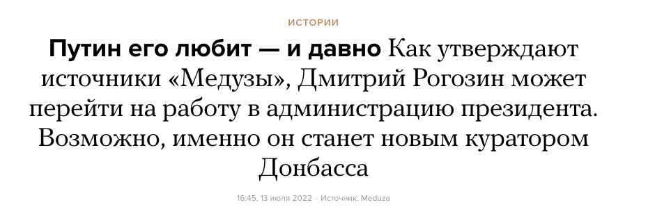 Также, по словам собеседников "Медузы", рассматривается вариант, при котором Дмитрий Рогозин будет одним из кремлевских кураторов "ДНР", "ЛНР" и занятых российскими войсками территорий Украины.