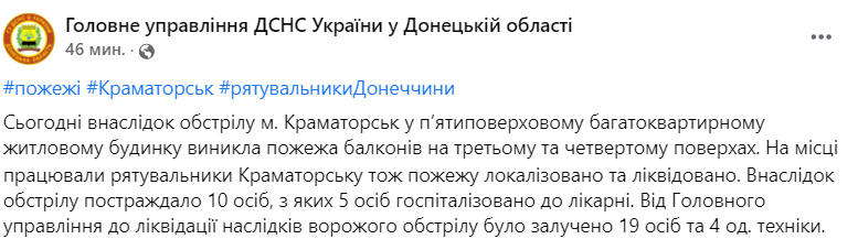 В результате сегодняшнего обстрела Краматорска пострадали десять человек, пятеро из них госпитализировали.