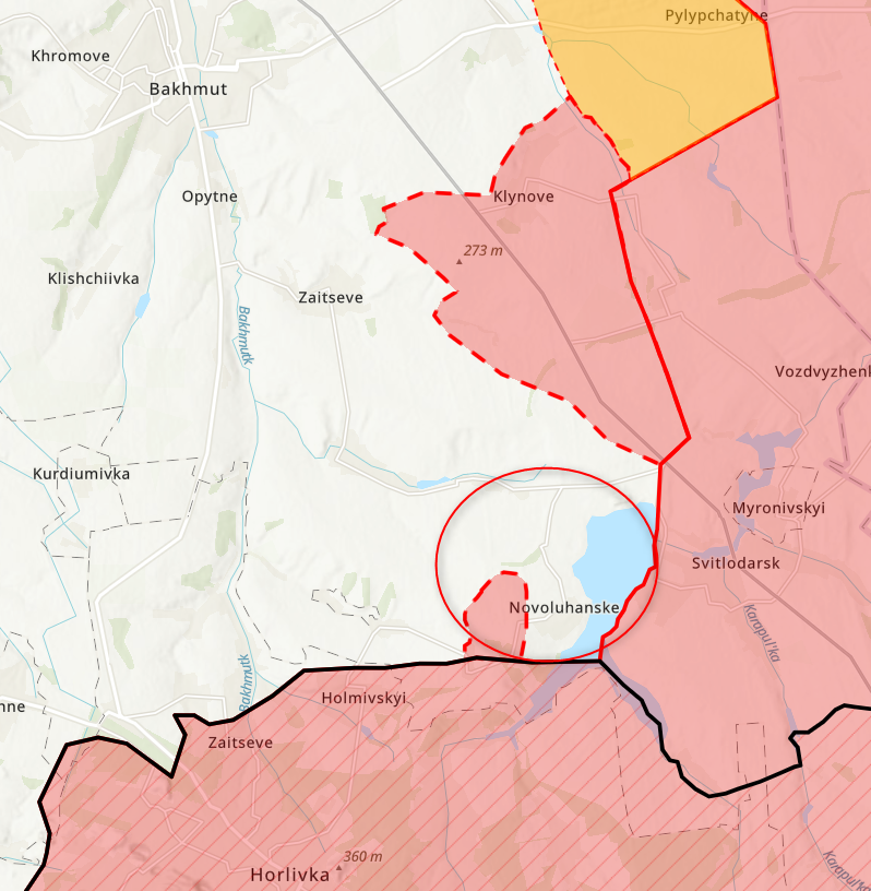 К югу от Бахмута ключевым направлением выглядит контролируемый ВСУ выступ в районе Новолуганского и Углегорской ТЭС. Там идут сильные бои, и закономерно, что противник будет пытаться этот выступ срезать. Новолуганское, судя по всему, сейчас разделено между ВСУ и россиянами.