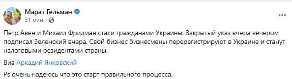 Про украинское гражданство Фридмана и Авена слухи ходят уже больше месяца