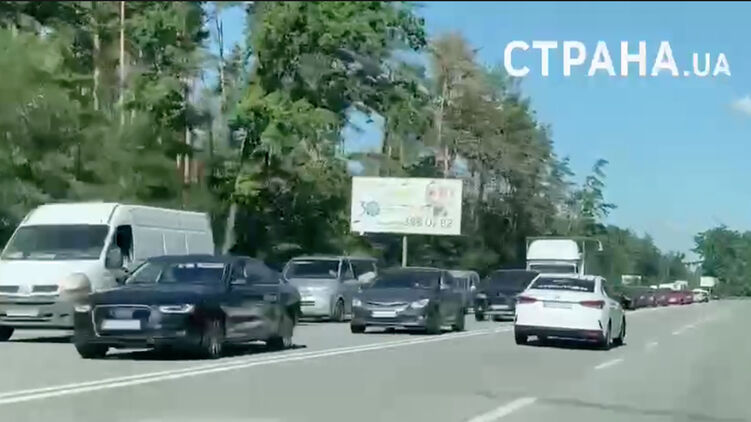 Очередь из автомобилей, ожидающих возможности проезда, растянулась на несколько километров. В скоплении машин стоят легковые автомобили, автобусы, грузовики.