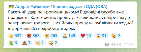 Ранее в Кировоградской области была объявлена воздушная тревога.