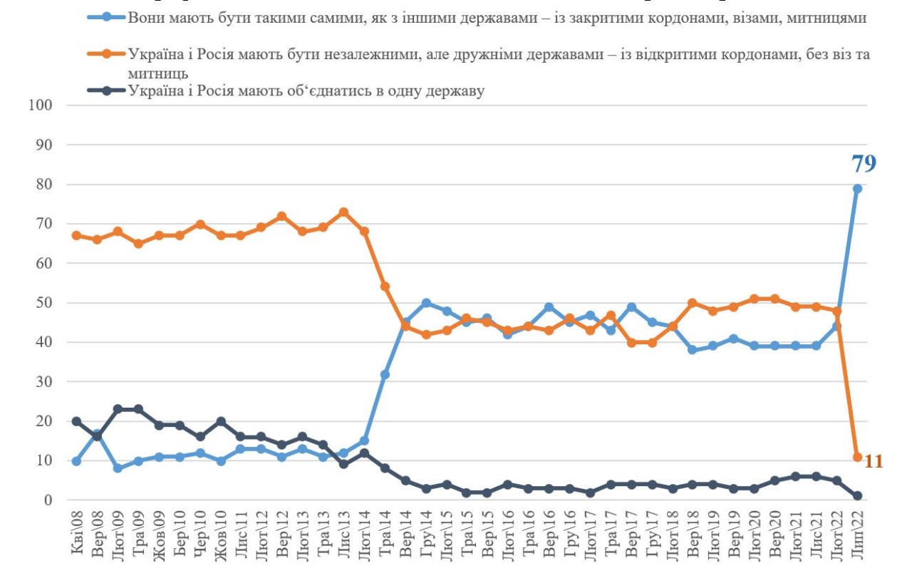 Также за время войны резко уменьшилось количество украинцев, которые выступают за дружественные отношения Украины и России: с 48% до 11%.