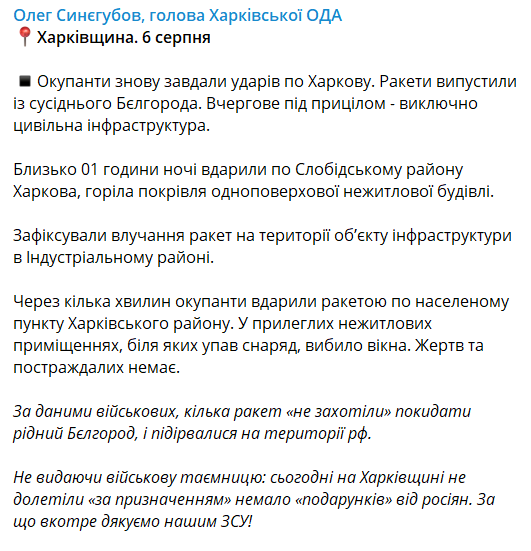 Ночью 6 августа россияне снова ударили по Харькову. Попадания зафиксированы в Слободском и Индустриальном районах.