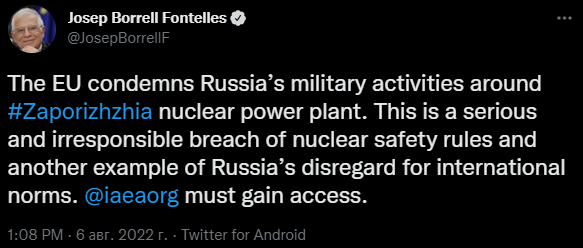 "ЕС осуждает военную деятельность России вокруг Запорожской АЭС. Это серьезное и безответственное нарушение правил ядерной безопасности и еще один пример пренебрежения Россией международными нормами. МАГАТЭ должно получить доступ", - написал Боррель у себя в Твиттере.