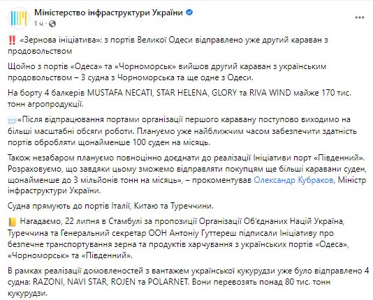 "Только что из портов "Одесса" и "Черноморск" вышел второй караван с украинским продовольствием – три судна из Черноморска и еще одно из Одессы", - сообщает министерство.