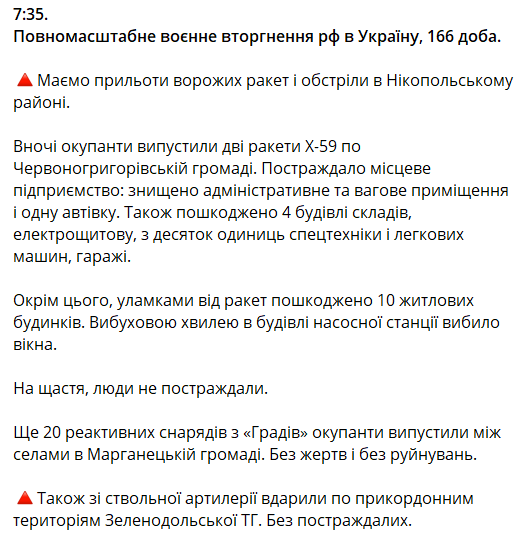 В целом, как сообщает губернатор региона Валентин Резниченко, в области ночью удары наносились по двум районам - Никопольскому и Криворожскому. В первом под огонь попали четыре села в двух громадах. В Марганецкой громаде зафиксировано 20 прилетов реактивных снарядов, выпущенных из градов.