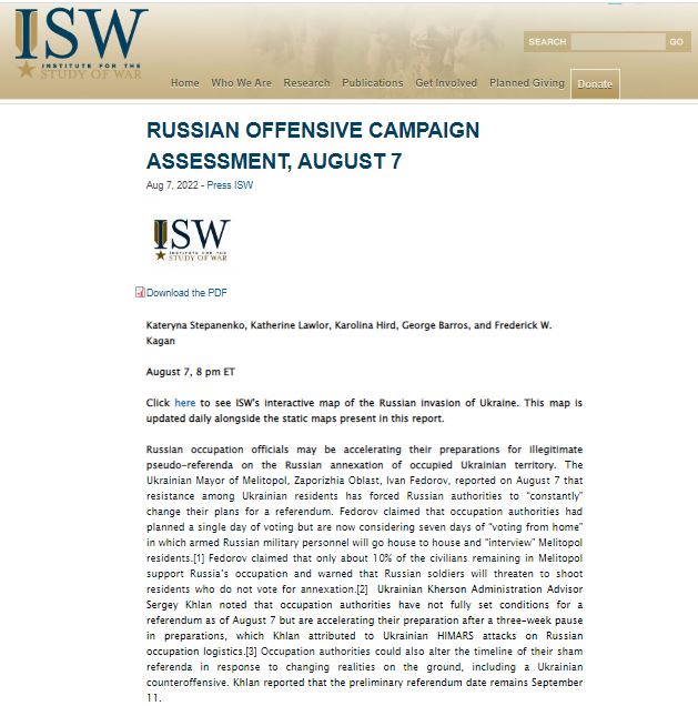 Ссылаясь на мэра Мелитополя Ивана Федорова, Институт изучения войны пишет, что в Запорожской области ранее оккупационные "власти" запланировали один день голосования, но теперь рассматривают возможность семидневного "голосования из дома", в течение которого вооруженные российские военнослужащие будут ходить по домам и "опрашивать" жителей Мелитополя.