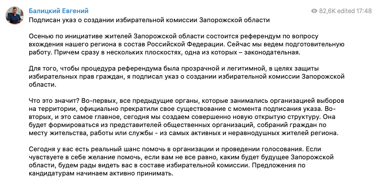 Позже в своем тг-канале он уточнил, что это "указ о создании избирательной комиссии Запорожской области", а "референдум" состоится осенью - "по инициативе жителей Запорожской области".