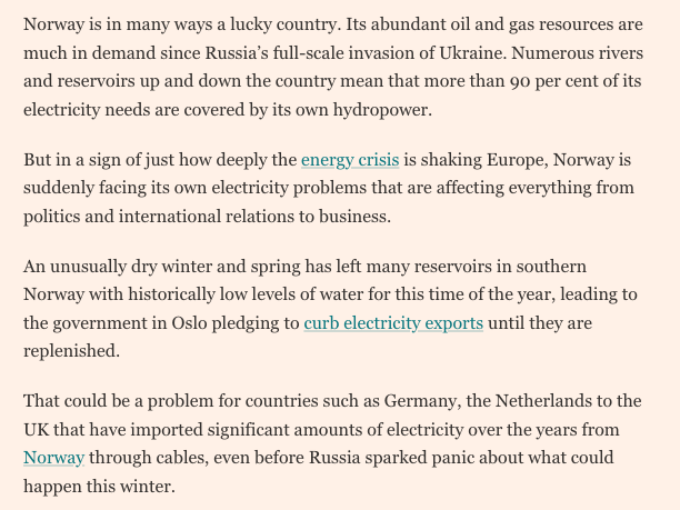 Норвегия обладает большими запасами нефти и газа, а многочисленные реки и водохранилища обеспечивают 90% ее потребностей в электроэнергии. Но из-за сухой зимы и весны уровень воды в водоемов рекордно упал. До их заполнения Кабмин Норвегии ограничил экспорт электроэнергии.